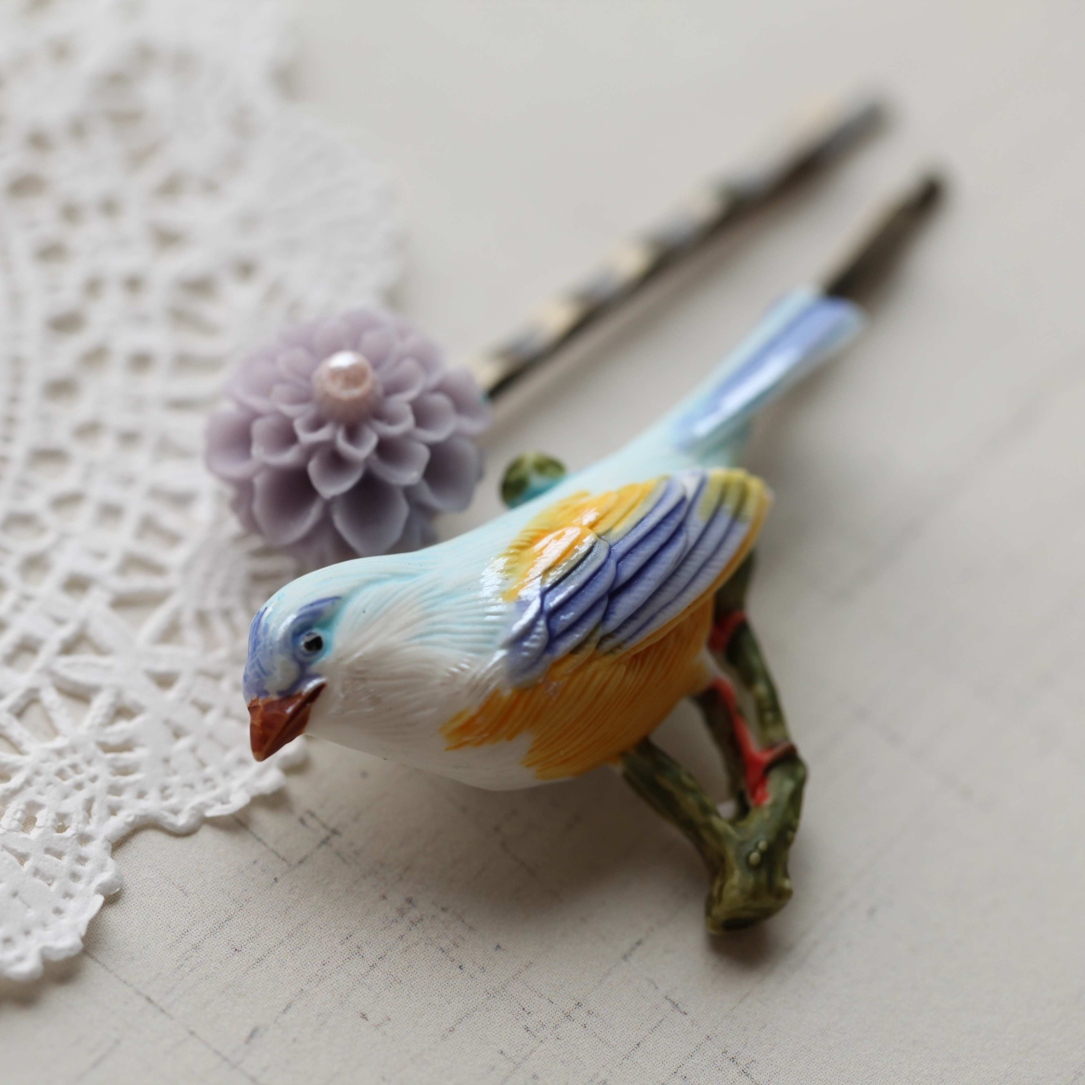 this pair of bobbi pins are made with a handpainted bird cabochon and flower cabochon